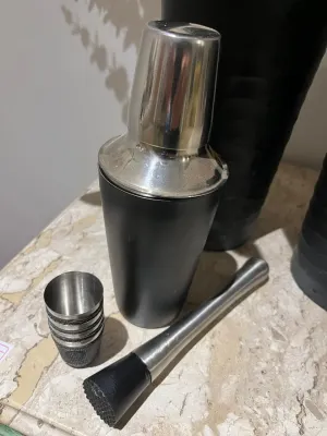 COQUETELEIRA COM DOSADOR E AMASSADOR E 4 COPINHOS SHOT METÁLICOS
