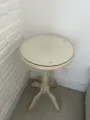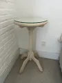 MESINHA DE CANTO PATINADA E COM TAMPO DE VIDRO