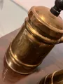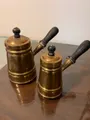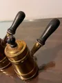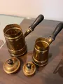Chaleiras de latao vintage com tampa. Cabis de madeira preta.