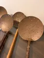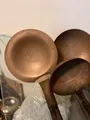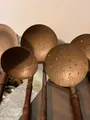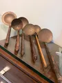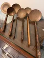 Conjunto de 6 utensílios de cozinha em metal envelhecido, com cabos de madeira. Peças robustas, com acabamento rústico e argolas para pendurar. Perfeitas para servir sopas, caldos, feijão ou como peça decorativa em cozinhas com estilo vintage. Ideal para quem busca charme retrô, durabilidade e praticidade no dia a dia ou como presente especial para amantes de cozinha