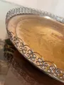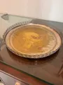 Travessa redonda de prata com acabamento envelhecido e delicado desenho em renda na borda. Peça vintage que traz charme retrô para qualquer ambiente. Ideal como centro de mesa, bandeja decorativa, porta-joias ou expositor de objetos. Em bom estado, com desgaste natural do tempo que valoriza a peça. Limpeza suave recomendada para conservar o brilho. Perfeito para salas, varandas, quartos ou mesas de buffet.