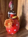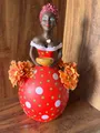 Vaso decorativo artesanal com estatueta feminina, peça única que traz personalidade e cor para qualquer ambiente. Pintado à mão com acabamento brilhante, vermelho com bolinhas brancas e verdes, adornado por flores laranja nas laterais. Ideal para sala, mesa de centro ou varanda; combine com plantas, velas ou itens decorativos. Excelente como presente ou para deixar a casa mais acolhedora e sofisticada.