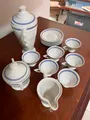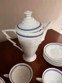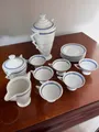 Jogo de chá em porcelana da Bavária com 15 peças, brancas com elegante faixa azul.