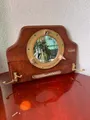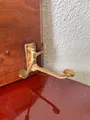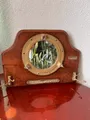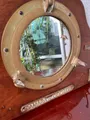 Espelho tipo escotilha de navio com moldura em bronze, base de madeira e penduradores de bronze.