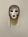 Máscara de carnaval com acabamento branco, detalhes em dourado e vermelho, perfeita para looks festivos e decoração. Seu destaque fica por conta das franjas longas com contas douradas e brancas que formam um colar elegante ao redor da máscara.