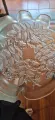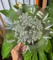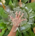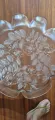 Prato decorativo em vidro com acabamento brilhante, no formato de folha, bordas onduladas e gravação floral central.