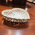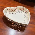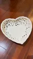 Travessa ou bowl de cerâmica branca em formato de coração, usada como item de decoração ou para servir petiscos.