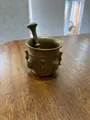 Conjunto pilão e almofar em bronze, acabamento artesanal com detalhes elegantes.