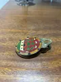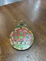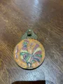 Pingente circular em metal com esmalte colorido e acabamento envelhecido.