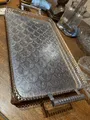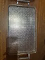 Bandeja retangular de metal com acabamento prata e superfície gravada. Alças duplas para facilitar transporte, borda trabalhada e padrão em leque que confere toque vintage e elegante. Ideal para servir petiscos, bebidas ou como suporte decorativo em mesa de centro, bancada ou aparador. Durável, fácil de limpar e perfeita para presentear.