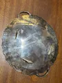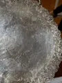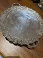 Bandeja decorativa em metal prateado com borda rendada e alças elegantes. Ideal para servir petiscos, frutas ou para decorar mesas e aparadores com estilo vintage.