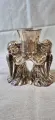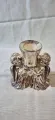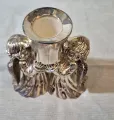Castiçal decorativo com acabamento prata, moldado com duas figuras de anjos que seguram o suporte central. Peça elegante e atemporal, ideal para a mesa de jantar, sala ou quarto, conferindo charme clássico ao ambiente. Perfeito para velas votivas pequenas e como presente de casamento ou inauguração, adicionando brilho sutil e estilo vintage. medida: 9cm