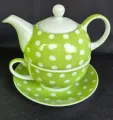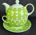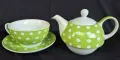 Conjunto de chá em cerâmica verde com bolinhas brancas (poá). Inclui bule com tampa e xícara com pires, tudo com acabamento vitrificado brilhante.