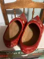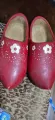 Tamancos de madeira vermelhos com delicadas flores brancas.