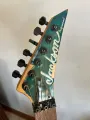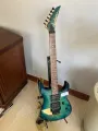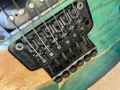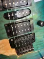Guitarra elétrica de corpo sólido com acabamento azul-teal deslumbrante. Série HSS (2 captadores humbuckers + 1 single) oferece timbres desde cleans brilhantes até riffs pesados. Ponte Floyd Rose de tremolo para afinação estável e dive bombs. Ideal para palco, estúdio ou jams em casa. Vem com alça; apresenta desgaste na pintura, porém funciona perfeitamente. Com avarias na pintura