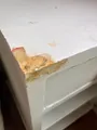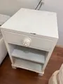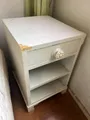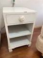 Para reformar. Mesas de cabeceira vintage em madeira, com gaveta e duas prateleiras. Acabamento branco envelhecido com leve desgaste, conferindo charme retrô ao quarto. Estrutura estável e prática para manter itens à mão.