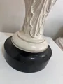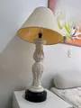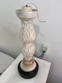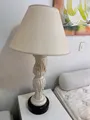 Par de abajures com base de madeira laqueada em dois tons. Marrom e branco envelhecido. Falta a cúpula e bocal em um deles.