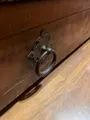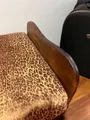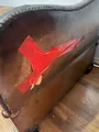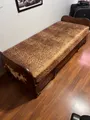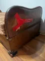 Cama solteiro rústica em madeira com alças,ferragens e revestimento em couro. Com muotas avarias. Colchão desbotado com marcas de uso.