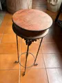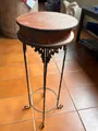 Mesa de apoio redonda em ferro com tampo de madeira, acabamento patinado e base de estilo vintage. Perfeita para sala, varanda ou cantinho de leitura. Estrutura robusta, pés em espiral e apoio central estável. Ideal para apoiar luminárias, livros ou plantas, agregando charme rústico e personalidade ao ambiente. Peça única, pronta para decorar e valorizar espaços com história.
