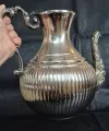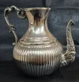 Grande e antigo bule confeccionado em metal espessurado à prata, bojo circundado por sucessão de sulcos verticais, seguido de gargalo afunilado, tampa campaniforme, dotada de abertura através de movimento basculante, encimada por puxador circular, bico curvilíneo coberto por folhagens, alça lateral cinzelada em acantos.
