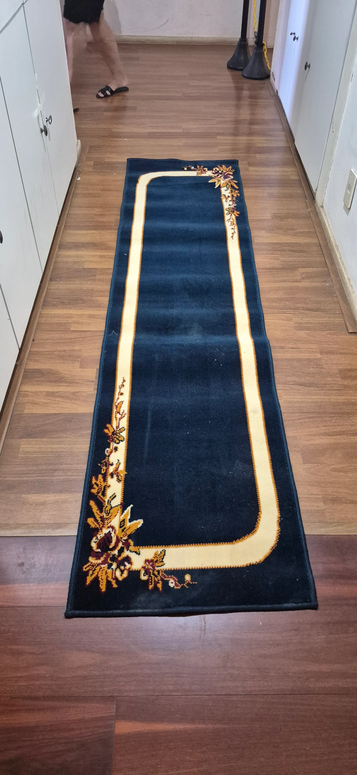 Tapete corredor azul marinho, com faixa bege e detalhes florais nos cantos. Ideal para hall, corredor ou porta de entrada, adicionando toque vintage e elegância ao ambiente. Tecido durável, macio ao toque e fácil de limpar, oferece proteção ao piso, reduz ruídos e evita quedas. Perfeito para casa, consultórios ou espaços que precisam de estilo e conforto.